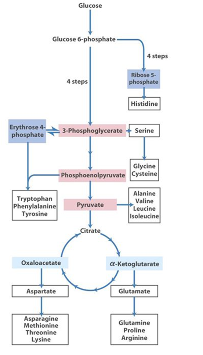 - All amino acids are derived from intermediates in Glycolysis, the Citric acid cycle, or the Pentose phosphate pathway.